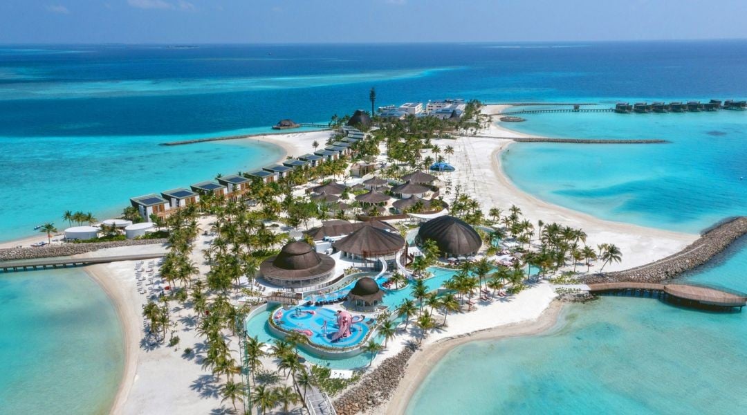 Our fun-filled island retreat features modern facilities designed with family-centric activities in mind. These include a stunning outdoor water complex with multiple attractions, such as a swimming pool, kids’ pool, meandering lazy river, and water playground, making it an unforgettable destination for all ages. There's endless entertainment for the family with 145 beach and overwater villas, diverse dining options, an exciting kids’ club, and the acclaimed SPA Cenvaree.